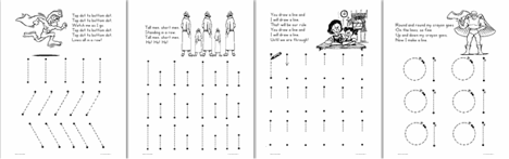 Once the student no longer has to think about how to form the letter correctly, s/he is ready for practice sheets. The purpose of the practice sheets are to move the student from a thinking or cognitive level to an automatic motor level. Usually, students in grade one or two are ready for a cognitive approach like the one used in the Printing Like a Pro Program.